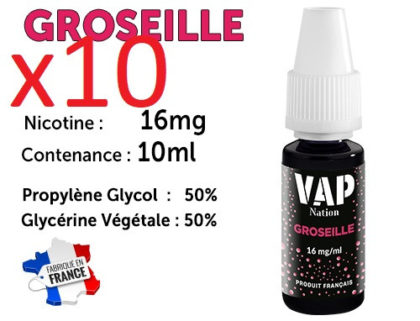 10 flacons e-liquides Vap nation groseille 16mg/ml de nicotine
