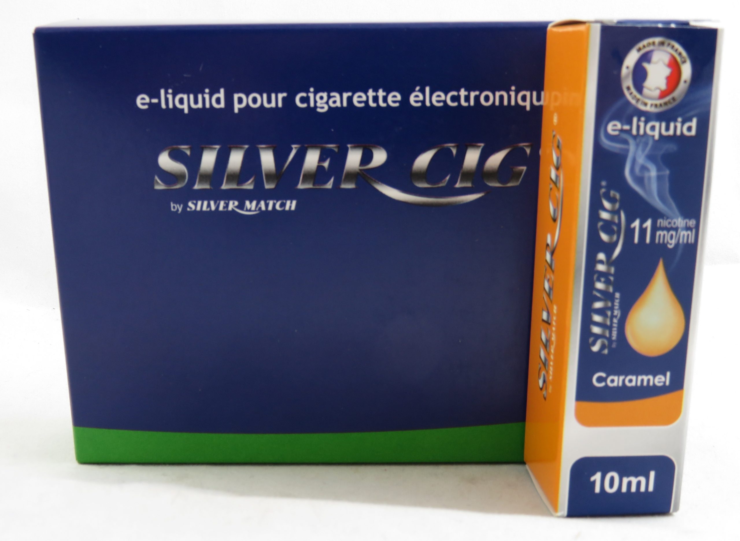 Boite de 5 flacons de e-liquide Silver Cig caramel 11mg de nicotine.