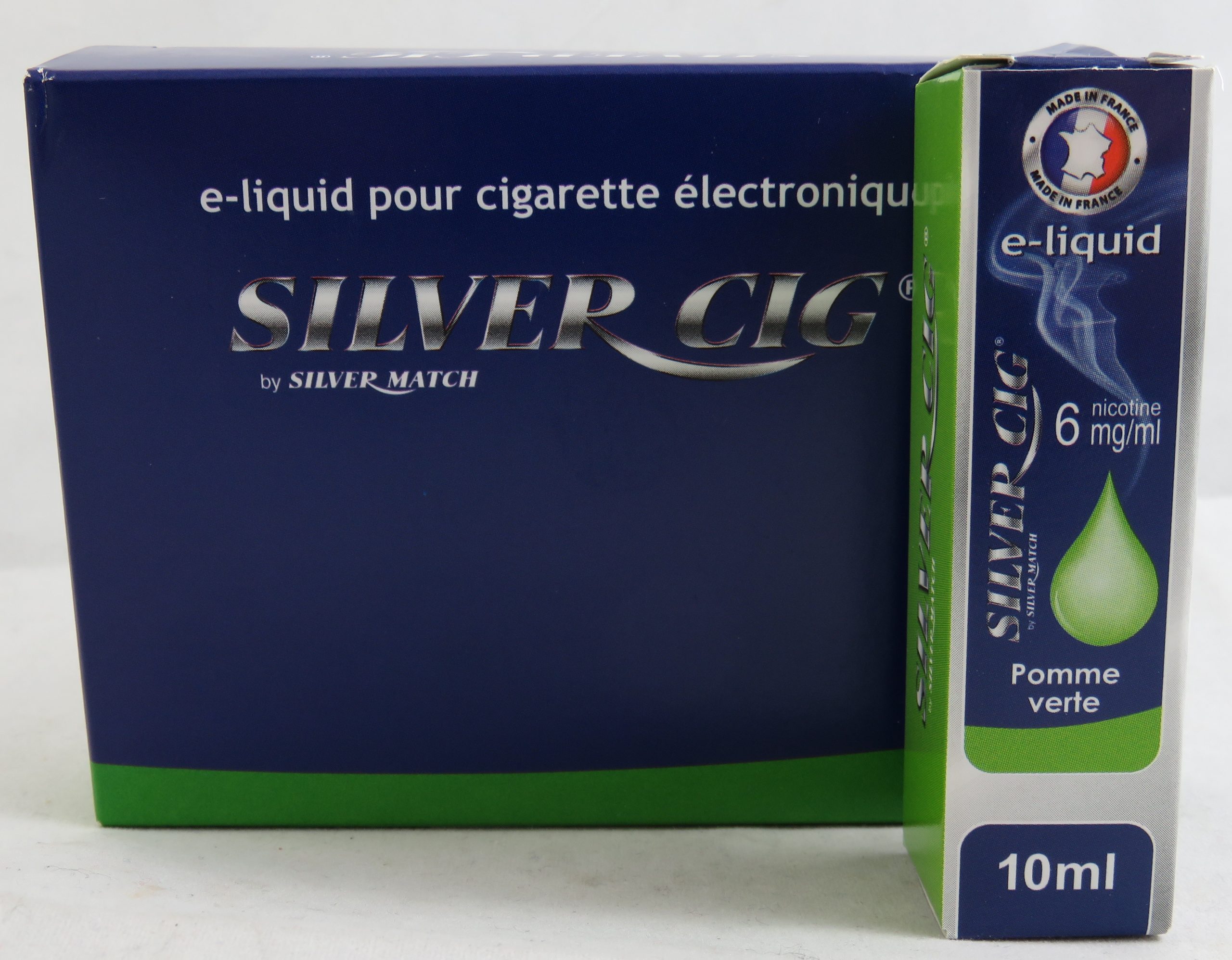 Boite de 5 flacons de e-liquide silver cig goût pomme verte 6mg/ml de nicotine.