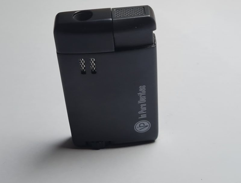 Briquet en métal IPV Hades couleur noir, une flamme tempête. Niveau de gaz sur le côté, molette de réglage de la flamme sous le briquet. Le rechargement s’effectue sous le briquet.