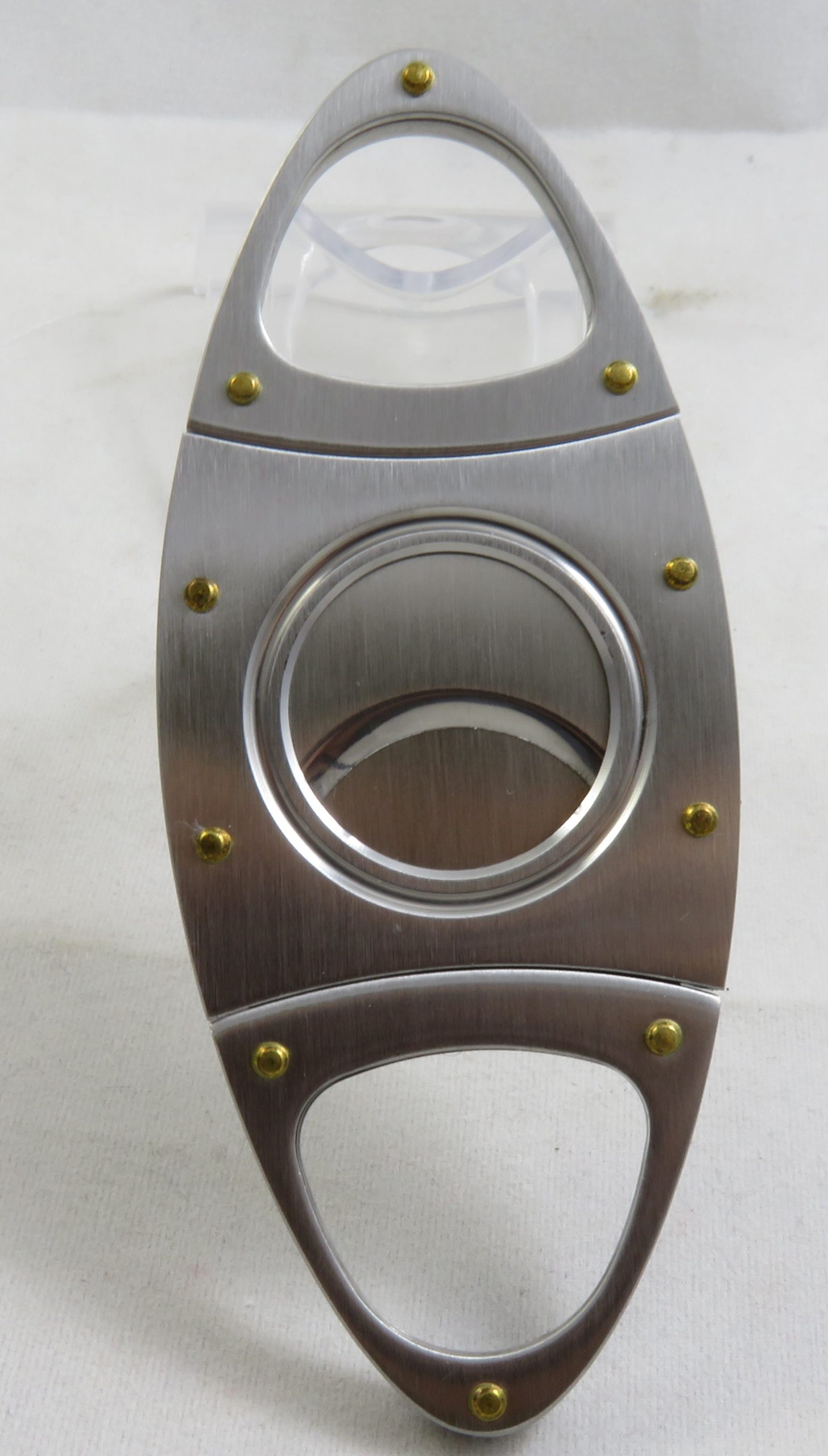 Coupe cigare en métal argenté brossé avec des clous dorés.