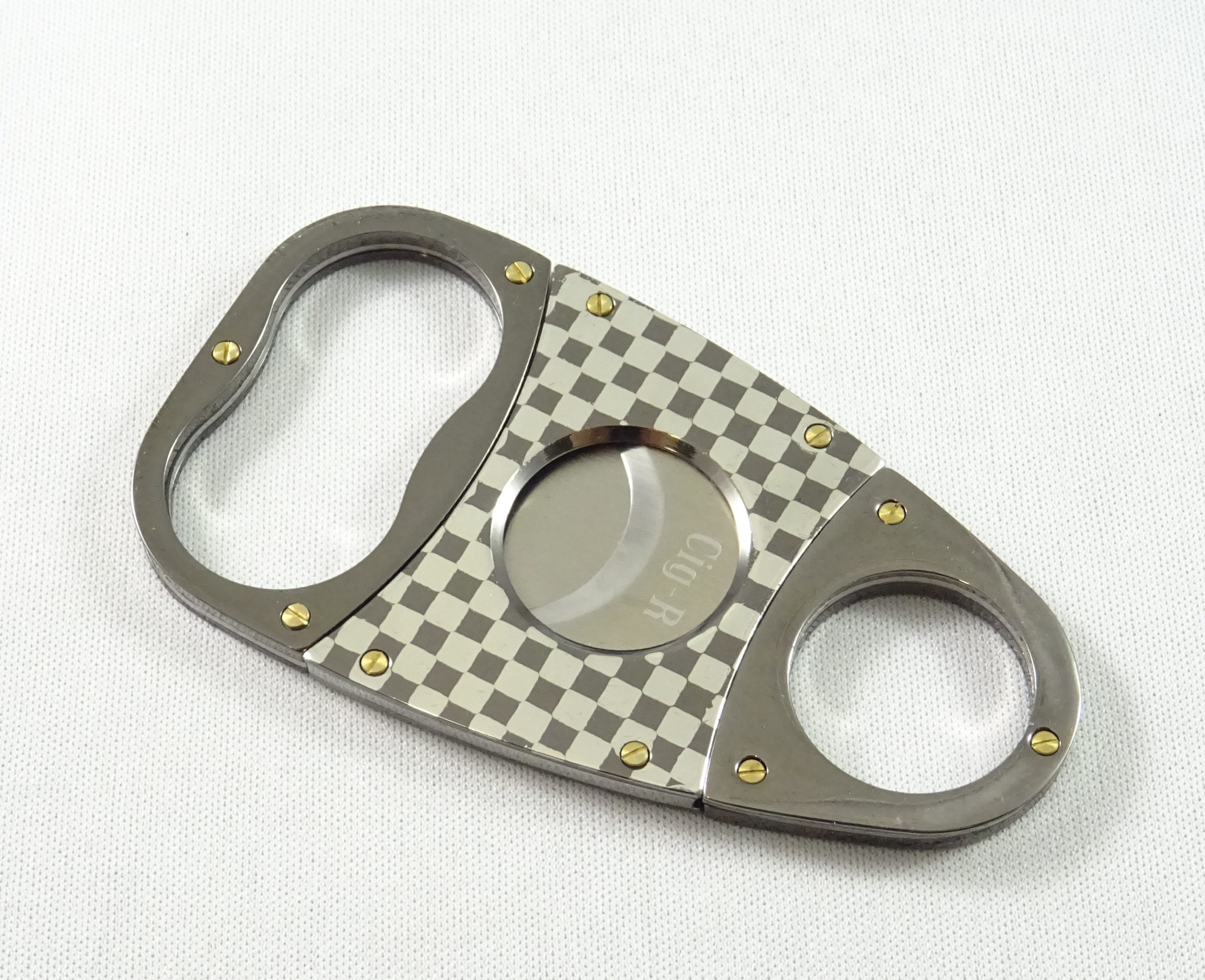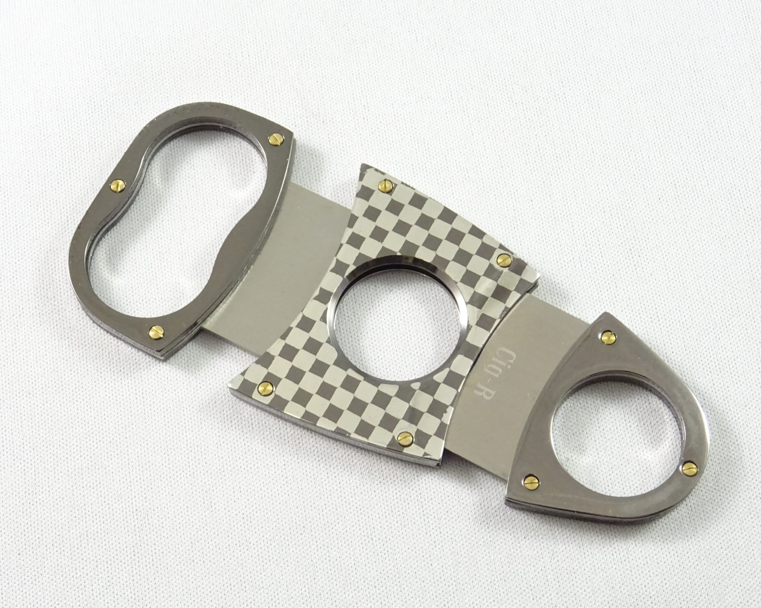 Coupe cigares en métal noir et damier finition vis dorés, prise en main 3 doigts.