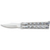 Couteau papillon manche noir, lame argent, avec sécurité.