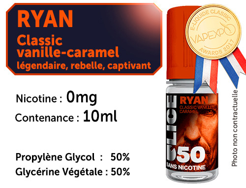 E-liquide D’LICE RYAN 0 de nicotine, classic vanille-caramel, légendaire, rebelle, captivant.