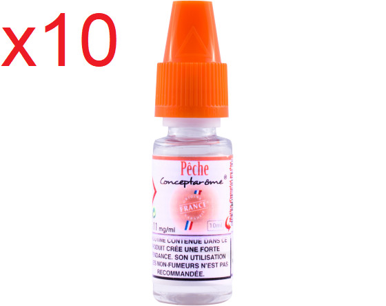 10 flacons E-liquide goût pêche 11 mg. Soit 2.30€ le flacon.