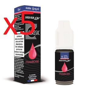 5 flacons e-liquides silver cig goût framboise 6mg/ml de nicotine.