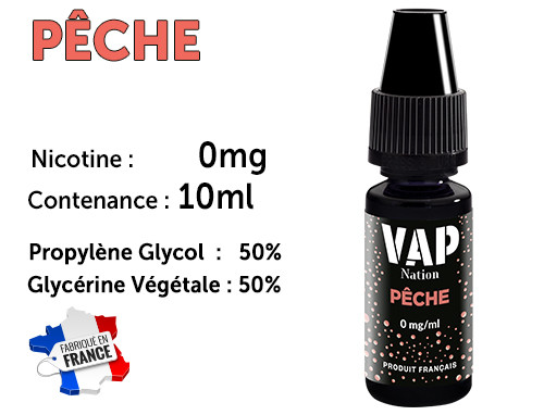 E-liquide Vap nation pêche 0 nicotine, 50/50.