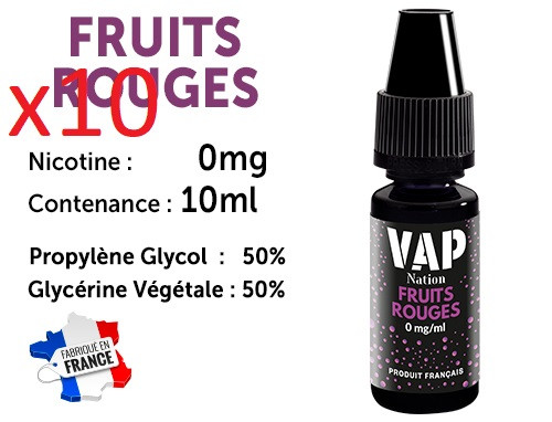 10 flacons e-liquides Vap nation fruits rouges 0 nicotine, 50/50. Un doux mélange subtile de fruits rouge .