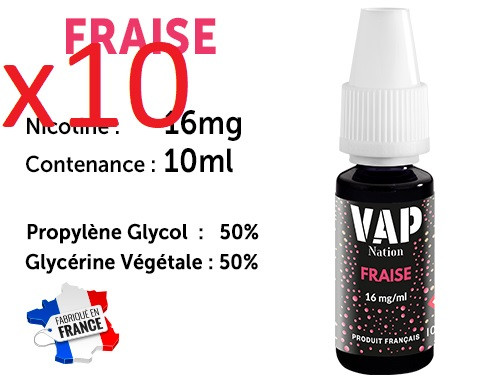 10 flacons e-liquides Vap nation fraise 16mg/ml de nicotine. 50/50