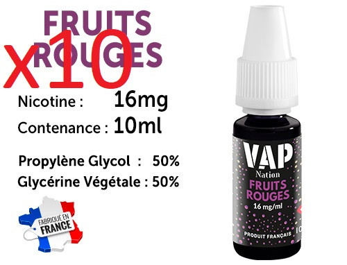 10 flacons e-liquides Vap nation fruits rouges 16mg/ml de nicotine. 50/50