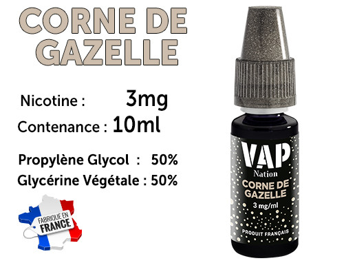 E-liquide Vap Nation corne de gazellel 3mg/ml de nicotine. Doux parfum d’une patisserie orientale.