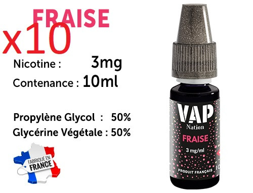 10 flacons e-liquides Vap Nation fraise 3mg/ml de nicotine.