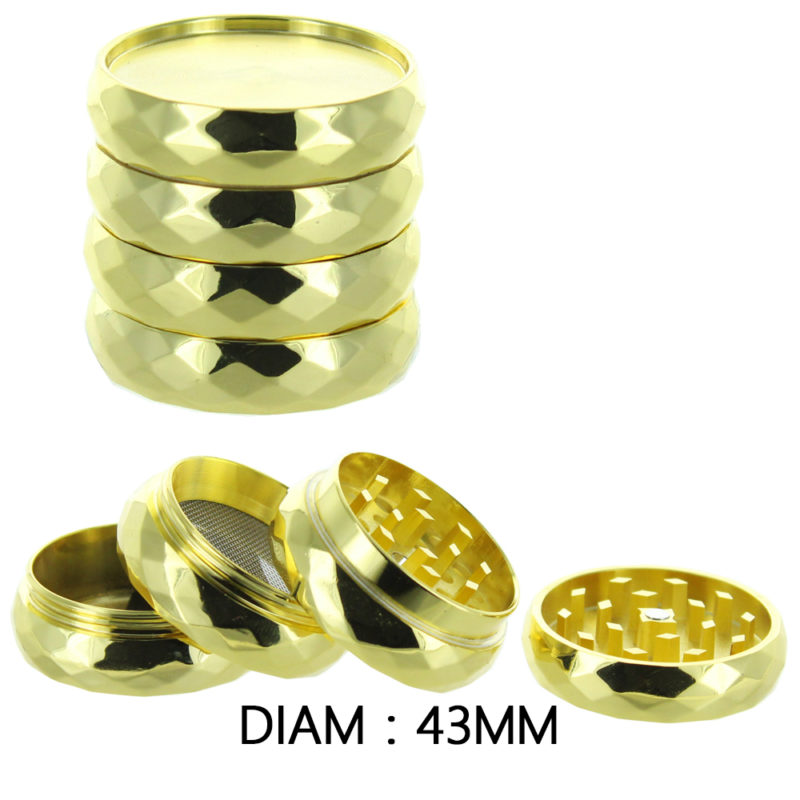 Grinder en métal “Cryptex 43” (Gold) démontable en quatre parties avec un couvercle aimanté. Ce grinder à herbe est équipé de dents en losange (16 sur le couvercle et 12 sur la partie inférieure) pour broyer finement votre tabac ou vos herbes aromatiques. Il possède également un filtre tamis pour récupérer la fine poudre dans la partie inférieure. Livrée avec une spatule noire en plastique.