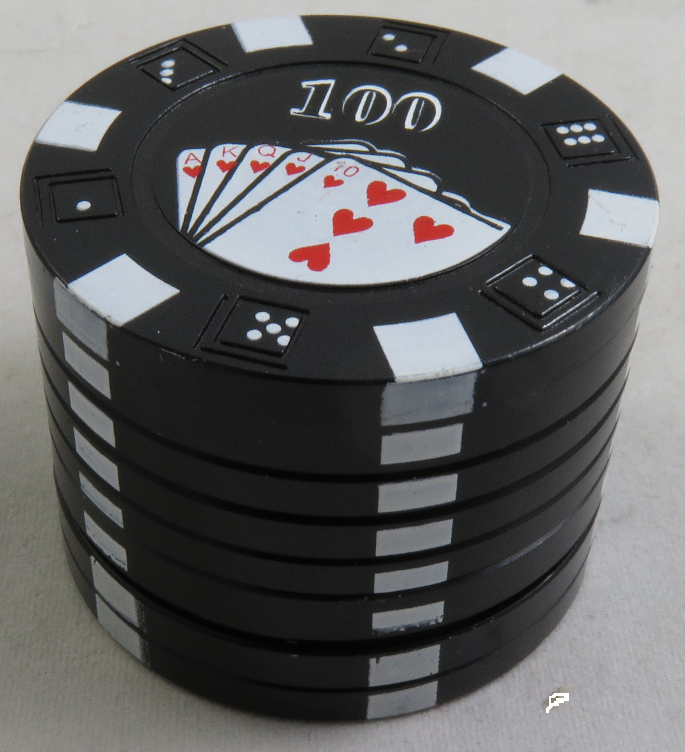 Grinder champ en forme de jeton de casino noir avec sur le dessus écrit 100. Diamètre 40mm.