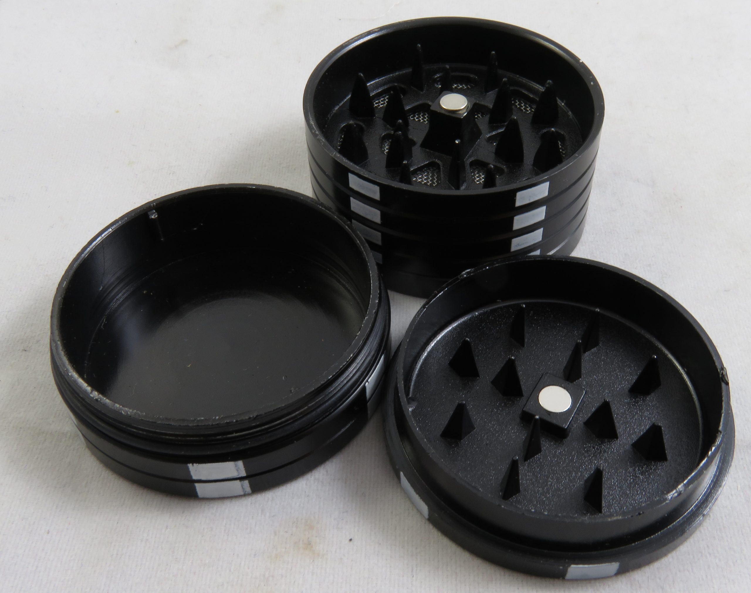 Grinder en métal constitué de 3 parties : les 2 premières sont équipées d’un aimant et des pointes types dent de requin pour un broyage éfficace.