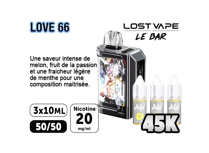 La puff 45K Le Bar par Lost Vape sera parfaite pour s’initier à la vape en toute simplicité. Ce kit complet contient une batterie de 1000mAh, une cartouche pré-remplie de 2ml et 3 flacons de 10ml d’e-liquide au sel de nicotine en 20mg.