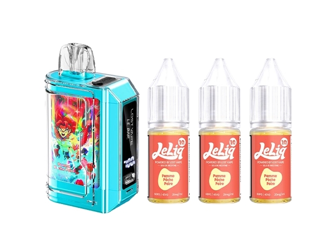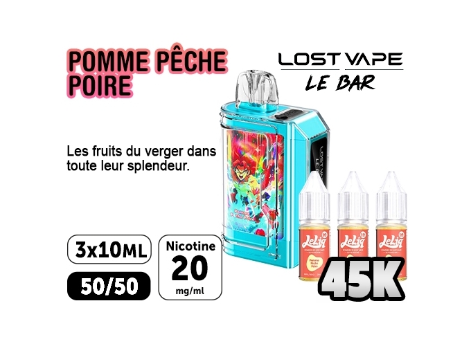 La puff 45K Le Bar par Lost Vape sera parfaite pour s’initier à la vape en toute simplicité. Ce kit complet contient une batterie de 1000mAh, une cartouche pré-remplie de 2ml et 3 flacons de 10ml d’e-liquide au sel de nicotine en 20mg.