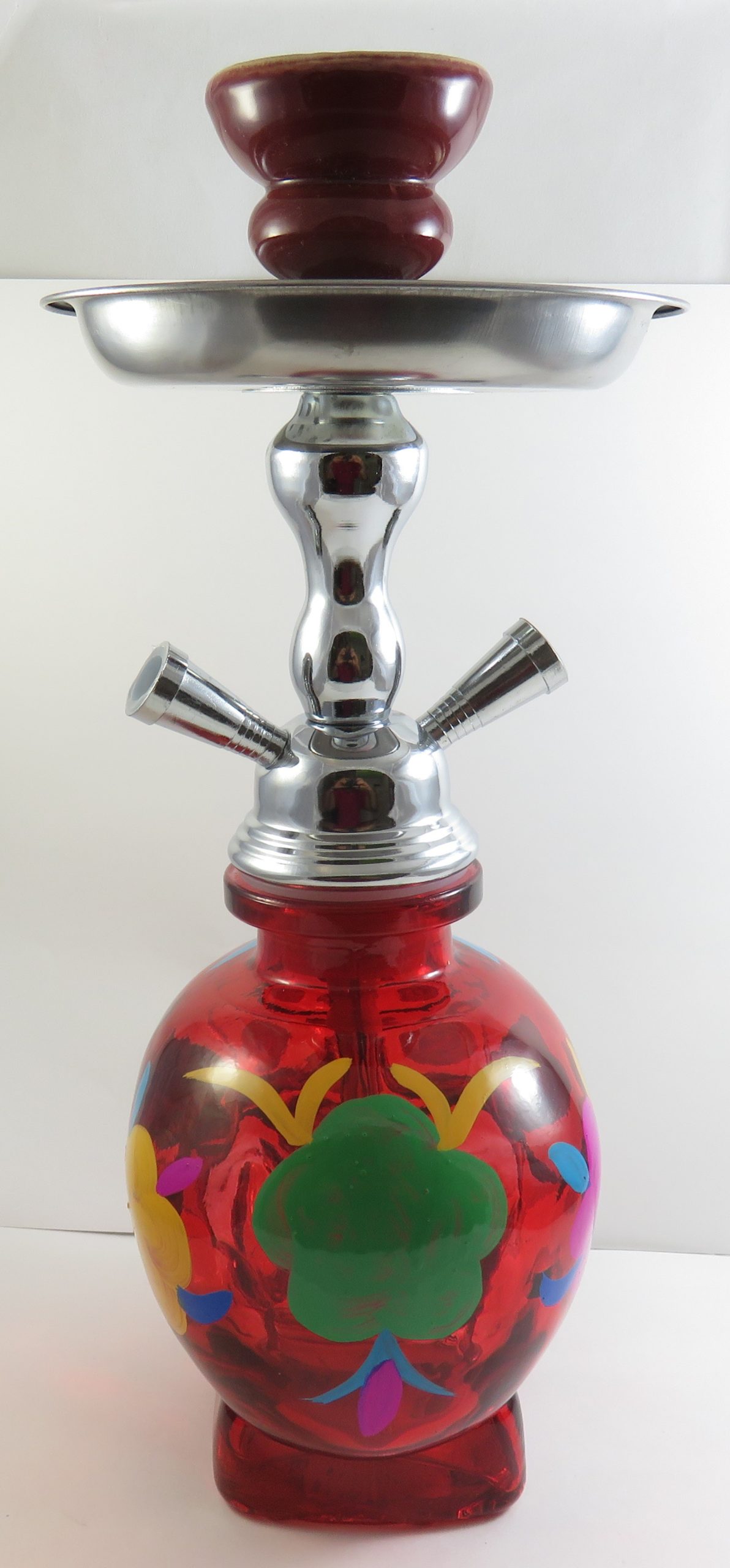 Narguilé réservoir en verre, avec foyer céramique rouge, 2 tuyaux rouges, vendu avec sa pince, une brosse, une feuille d’aluminium perçé, un rouleau de charbon.