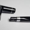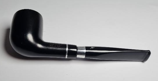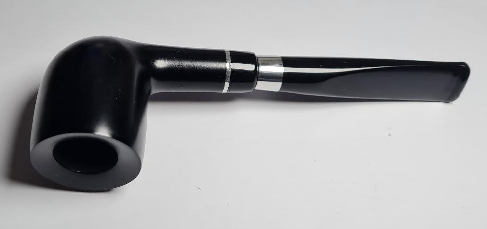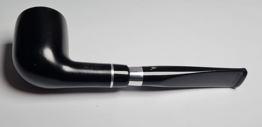 Pipe italienne Aldo Velani noire, tige bague argent, tuyau en acrylique monté d’une en métal argenté, sans filtre.