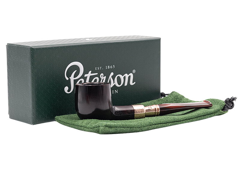 Cette pipe en bois de bruyère est réalisée de façon traditionnelle dans les ateliers de la maison Peterson à Dublin. Elle est vendue accompagnée de son sac en dain véritable dans un étui cartonné aux couleurs de la marque.