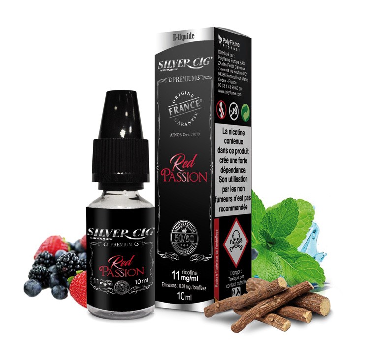 E-liquide Silver Cig goût red passion, fruit rouge 11mg/ml. Un parfum de fruit rouge relevé d’une note de réglisse, un bouquet aux accents de printemps