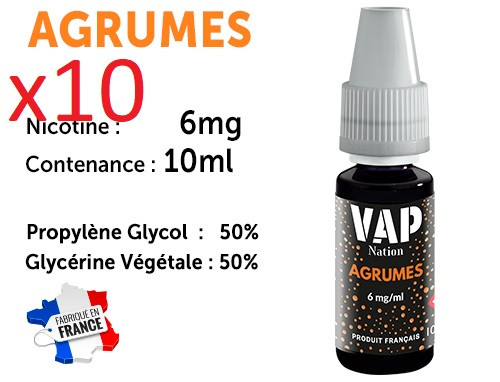 10 flacons e-liquides Vap Nation agrumes 6mg/ml de nicotine. Mélange citron, pamplemousse, orange sanguine.