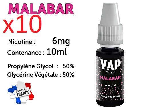 10 flacons e-liquides Vap Nation malabar 6mg/ml de nicotine.