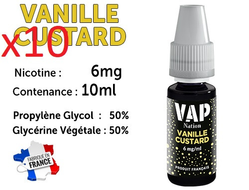 10 flacons e-liquides Vap Nation vanille custard 6mg/ml de nicotine.