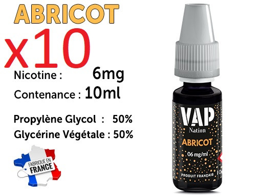 10 flacons e-liquides Vap Nation abricot 6mg/ml de nicotine.